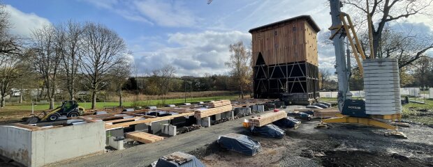 Seit September 2024 laufen die Arbeiten für den Ersatzneubau. Der Betrieb ist seitdem eingestellt und der ehemalige Nordflügel ist komplett verschwunden. Stück für Stück wurde die alte Konstruktion mit den schadhaften Stahlverbindungen abgebaut. Anschließend wurde der Zustand der Fundamente untersucht und die Sanierung geplant. Die Sanierungsarbeiten sowie die weiteren Tiefbau- und Gründungsarbeiten wurden von der Fa. Pfister aus Schweinfurt ausgeführt. In der vergangenen Woche wurde nun der Kran für den Wiederaufbau des Nordflügels gestellt. Beim Neubau kommen weitgehend traditionelle Holzverbindungen zum Einsatz. Die Arbeiten führt die Firma Holzbau Eyrich-Halbig aus Oberthulba durch.